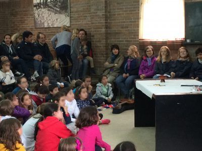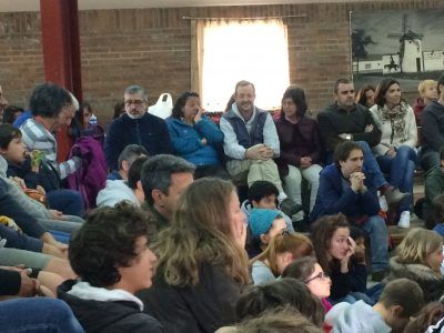 Los API’s de Tercero y Cuarto nos propusieron un divertido juego donde podíamos ir conociendo los nombres y lo que nos gustaba o no. Continuamos este rato con un “clamor”, nos dividimos entre los familiares y los niños y niñas de Génesis. Los API’s proponían palabras y los dos equipos tenían que cantar canciones que incluyeran esas palabras. Los equipos se alternaban y así hasta que a alguno de los dos equipos se le acababa el repertorio en cuyo caso perdía el “minipunto”. Por último hicimos unas carreras con pelotas y cucharas.