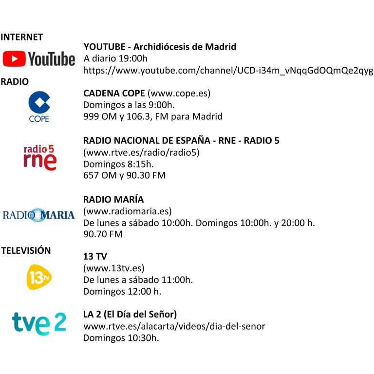 - Todos los fieles cristianos de la diócesis de Madrid están dispensados de la asistencia a la celebración dominical. Podemos seguir la santa Misa por radio o televisión, así como por internet. El Arzobispado de Madrid está retransmitiendo por su canal de YouTube (www.youtube.com/archimadrid) la celebración de la Eucaristía diariamente, a las 19:00 horas desde la catedral de Santa María la Real de la Almudena”.